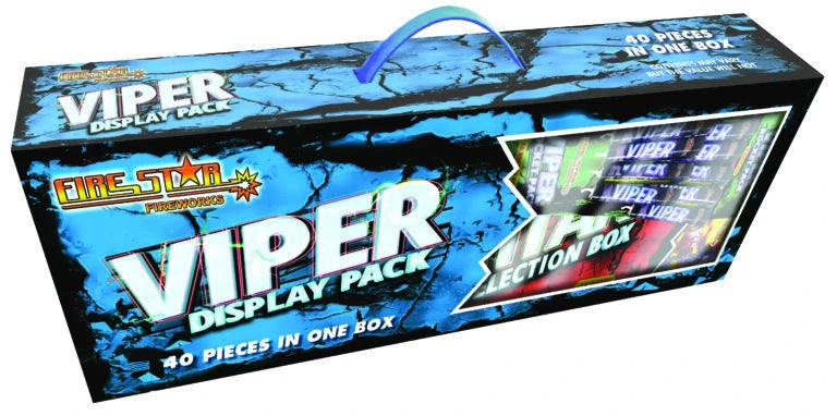 Unleash the serpent within! This 40-piece Viper Display is your ticket to mesmerizing pyrotechnic performances that'll have your audience hissing with delight. Each piece delivers striking visual impact with the precision and attitude you'd expect from a viper—quick, sharp, and absolutely captivating. Perfect for adding a venomous punch to your fireworks arsenal, this collection combines reliability with showstopping flair. Watch jaws drop as these beauties light up the night sky with their signature intensity and style.